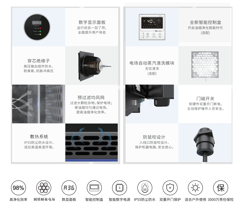 超潔系列:設(shè)備在實(shí)驗(yàn)室及題定處理鳳暴條件下最高去除油煙效率為98%。
